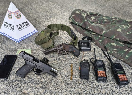A Polícia Militar apreendeu materiais do tráfico de drogas, entre os quais duas armas, e um adolescente de 16 anos,…