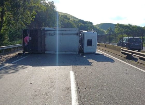Caminhão de lixo tomba e interdita a Via Dutra, em Barra Mansa