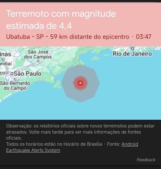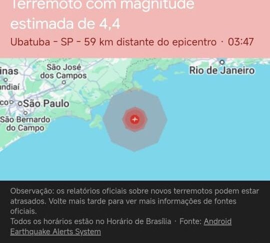 Ubatuba – Na madrugada desta sexta-feira (14), moradores de São Paulo e do Rio de Janeiro que possuem celulares com sistema operacional Android receberam um alerta do Google sobre um suposto terremoto no mar, a 55 km de Ubatuba, no litoral paulista.