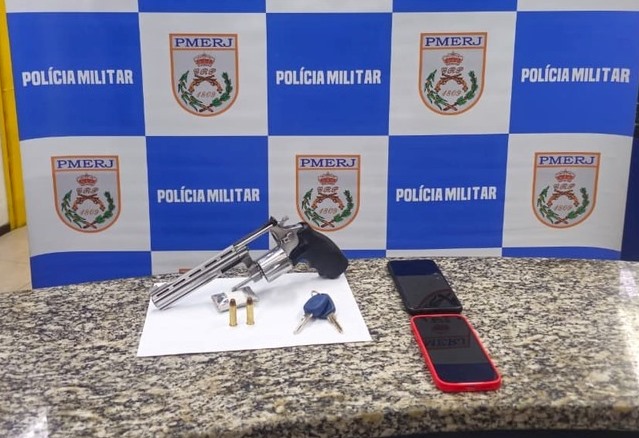 Na revista no interior do carro, a arma – com duas munições intactas – foi encontrada. Ele foi apresentado na delegacia de Barra Mansa para o registro da ocorrência. (Foto: Polícia Militar)