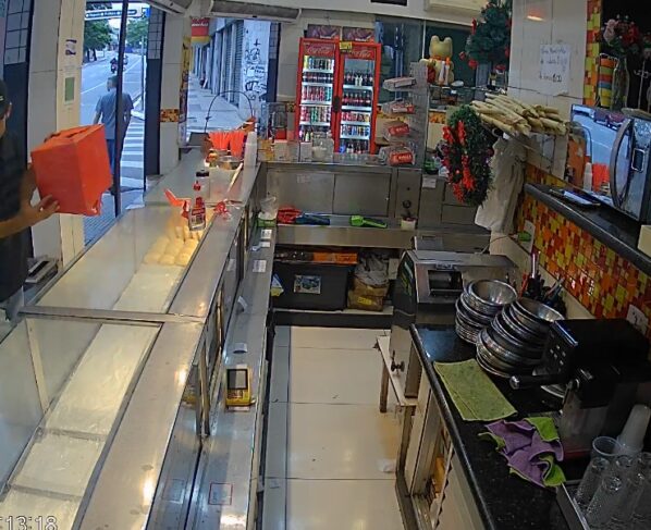 As imagens enviadas ao jornal mostram que o crime aconteceu às 6h13min. Um homem de camisa e boné de cor preta, bermuda jeans e chinelo, entra no local, pega a caixa e foge correndo em direção à Rua São João. “Muita sacanagem. A gente tá desde outubro juntando pra dividir com os funcionários”, lamentou uma mulher que trabalha no local.