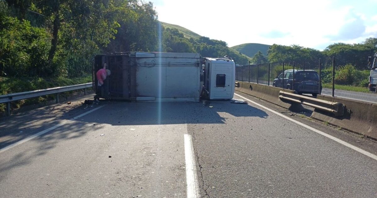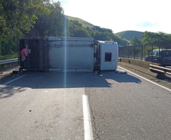 Um caminhão de lixo tombou e interditou a pista sentido Rio de Janeiro, da Via Dutra, nesta sexta-feira (24), no distrito de Floriano, em Barra Mansa (RJ).