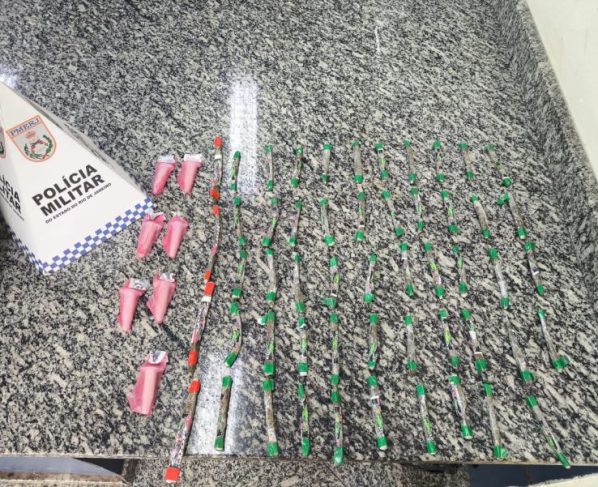 Durante a verificação no interior do veículo, os policiais encontraram uma sacola com sete pinos de cocaína, além de 53 tiras de maconha prensada, sendo quatro embaladas com identificação “CPX B.P 25” e outras 49 com a marca “CPX B.P 10”.