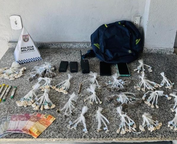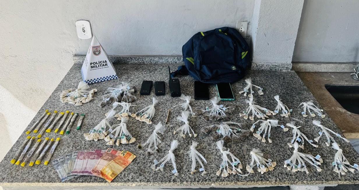 De acordo com a Polícia Militar, com a dupla foram apreendidos 100 papelotes de cocaína, 42 trouxinhas de maconha, 14 tiras da mesma droga, 13 pedras de crack, três papelotes de haxixe, um rádio transmissor, dois celulares, uma mochila e R$ 55.
