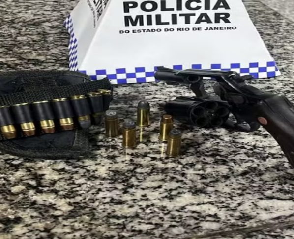 Um revólver com 17 munições intactas foi encontrado no local, além de um coldre. Ele foi levado para a delegacia da cidade, onde foi autuado pelos crimes, ficando à disposição da Justiça. (Foto: PM/Divulgação)