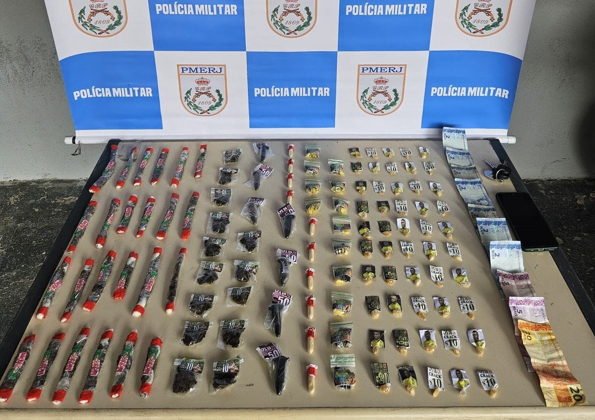 A ação foi do GAT 1 (Grupamento de Ações Táticas) na verificação de uma denúncia de tráfico. Os agentes apreenderam 17 pinos de cocaína, 38 embalagens de maconha, 51 pedras de crack, 13 comprimidos de ecstasy e R$ R$ 46 em espécie.