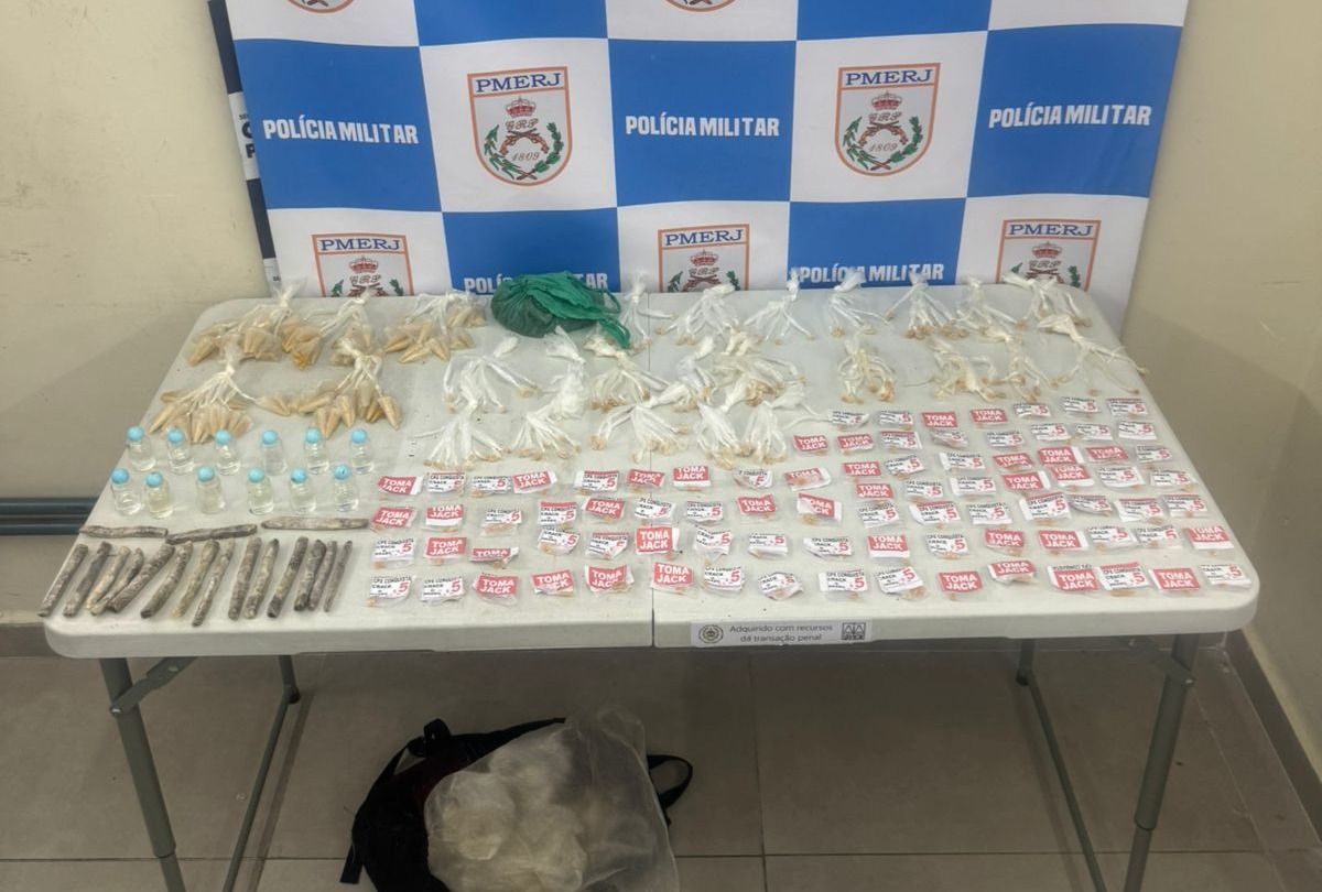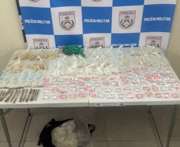 A PM informou que ele estava acompanhado de outras duas pessoas, que fugiram. Com o suspeito, os agentes apreenderam 79 pedras de crack e, após varredura no local, encontraram 100 tubos de cocaína, 17 sacolés de maconha, 12 frascos de loló e 165 pedras de crack. (Foto: PM/Divulgação)