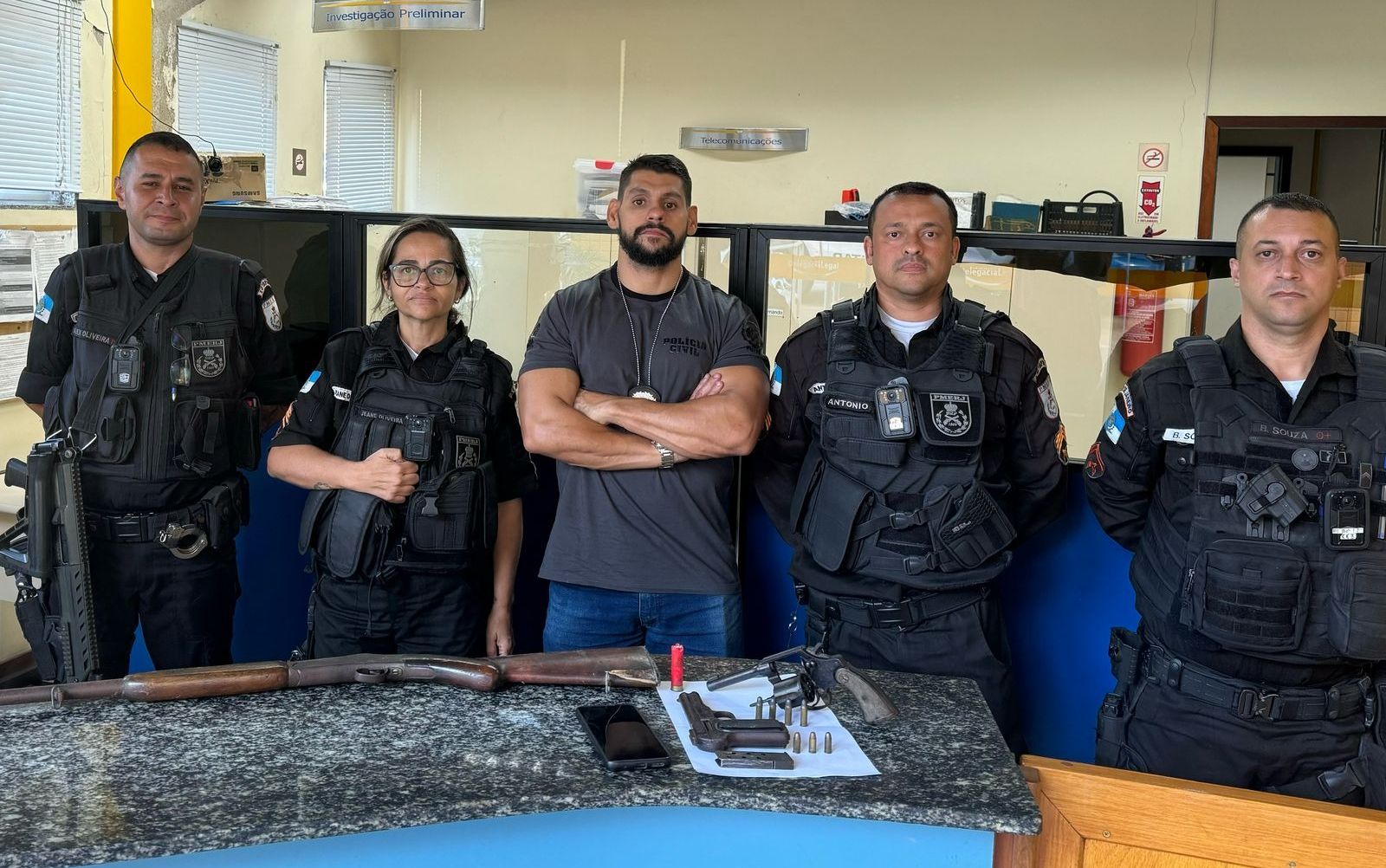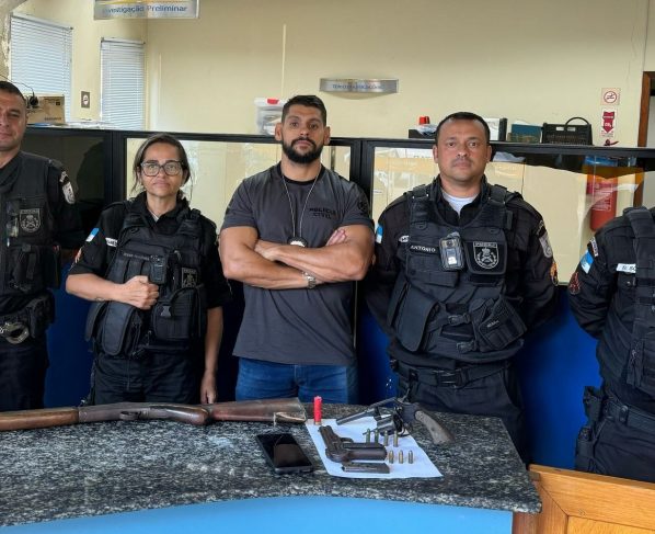 Na casa, os policiais encontraram uma pistola calibre 765, um revólver calibre 32 e uma espingarda caibre 28. Também foram recolhidas munições de todos esses calibres. O suspeito assumiu a propriedade das armas, que não possuem qualquer tipo de registro ou autorização.