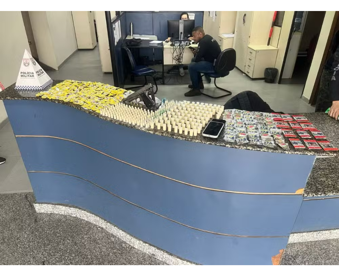 Ainda de acordo com a PM, durante a ação, os policiais apreenderam 280 pinos de cocaína, 130 pedras de crack, 57 tabletes de maconha, cinco frascos de “black lança”, uma pistola calibre .45, um carregador, quatro munições e dois celulares.