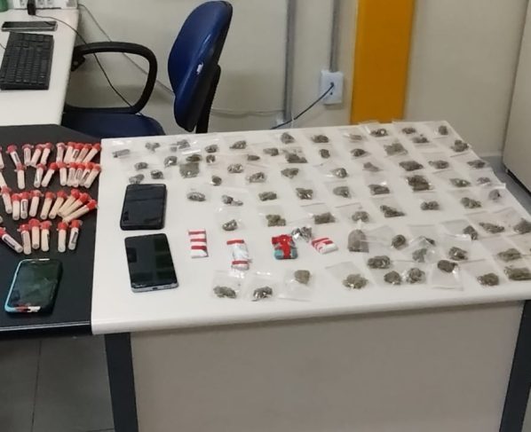 Durante as buscas no imóvel, os policiais encontraram 70 trouxinhas de maconha, 36 pinos de cocaína e três celulares. Parte das drogas estava dentro de uma bolsa, junto com os aparelhos celulares, e outra parte escondida nos furos de tijolos. O suspeito foi detido e levado para a delegacia. Após consultas no sistema, foi constatado que ele possui anotações criminais por lesão corporal culposa no trânsito, tráfico de drogas e porte de arma.