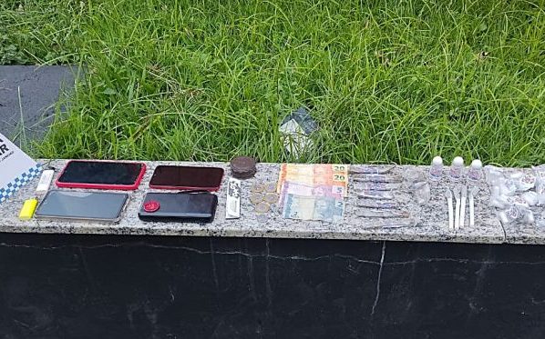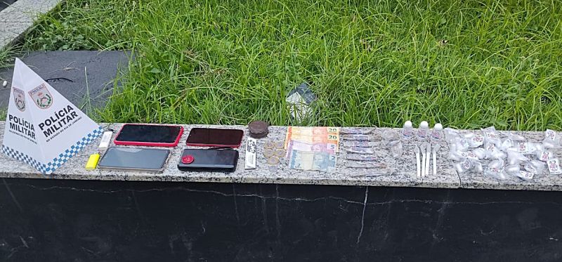 Ao todo, foram apreendidos 25 pinos de cocaína, sete porções de maconha embaladas para venda, outras duas porções adicionais da droga, três frascos de lança-perfume, quatro celulares, carregador portátil e R$ 52,50.