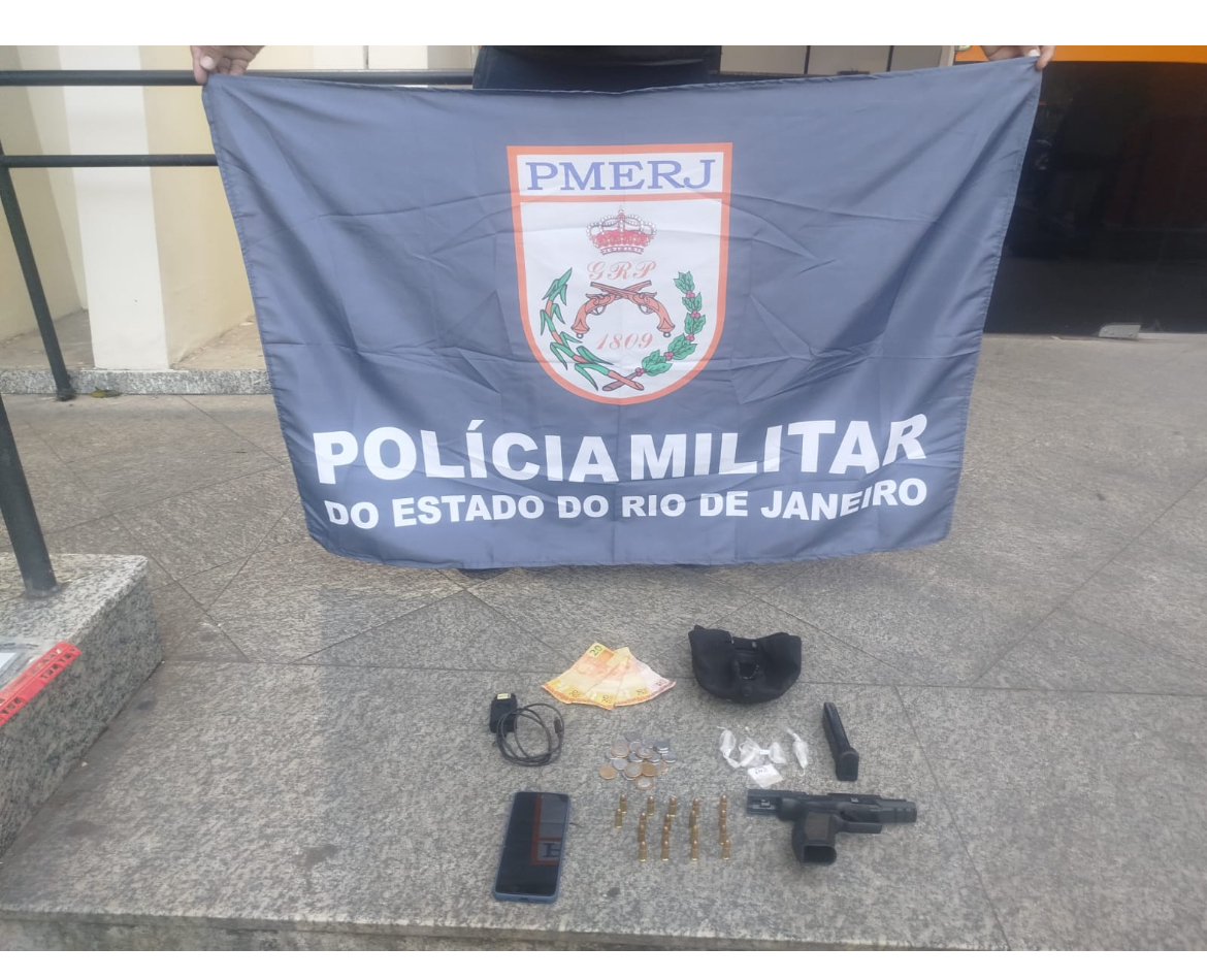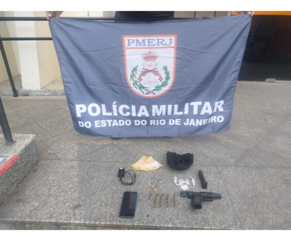 Na revista pessoal, os agentes encontraram uma pistola Canik TP9, calibre 9 milímetros, municiada com 18 munições, além de quatro pinos de cocaína, uma pedra de crack, um aparelho celular, uma gandola camuflada e a quantia de R$ 83 em dinheiro.
