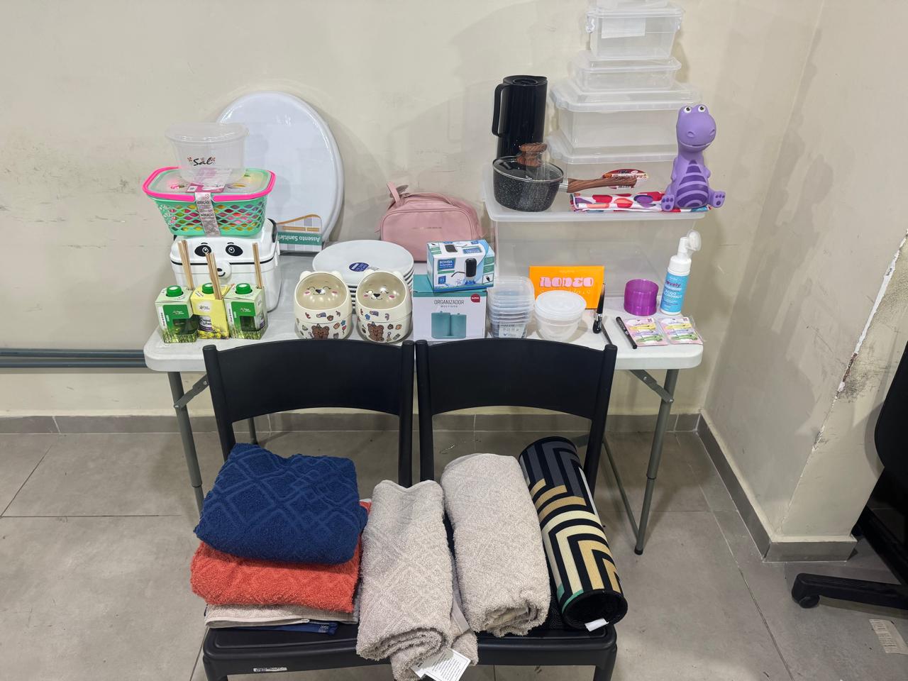 De acordo com a Polícia Militar, a suspeita precisou ser levada para a delegacia. Foram recuperados seis pratos, quatro toalhas de banho, três potes, uma garrafa de café, um conjunto com cinco potes, uma panela, uma tampa de vaso sanitário e brinquedos infantis. Ainda não há informações sobre como ficou a situação dela na delegacia. (Foto: PM/Divulgação)