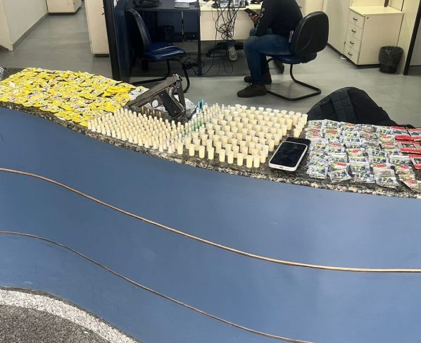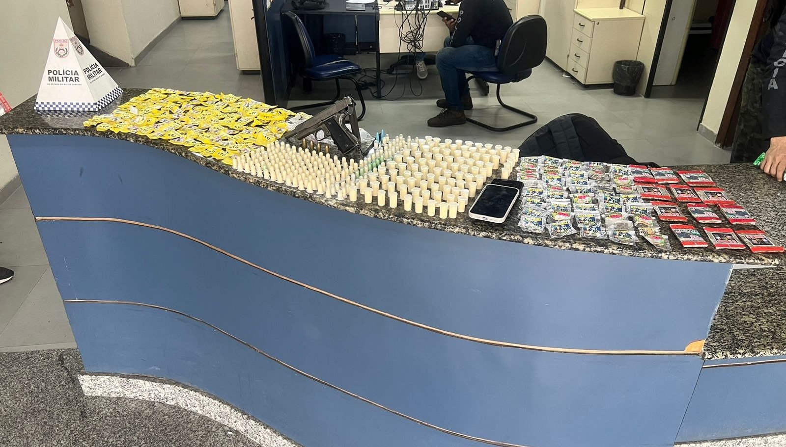 Na ação, os policiais apreenderam 280 pinos de cocaína, 130 pedras de crack, 57 tabletes de maconha, cinco black lança, uma pistola calibre 45, um carregador de pistola, quatro munições e dois telefones celulares.
