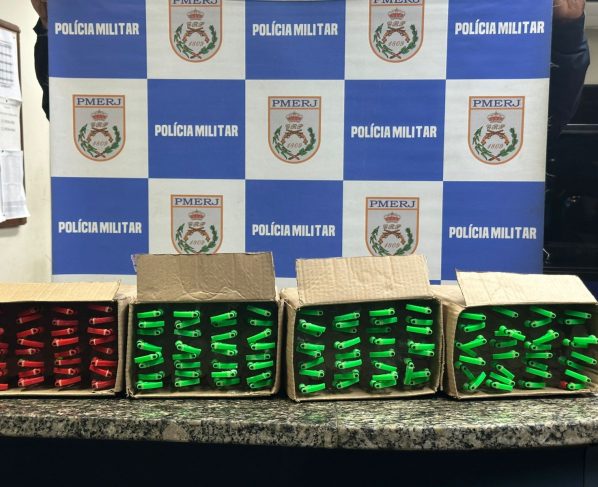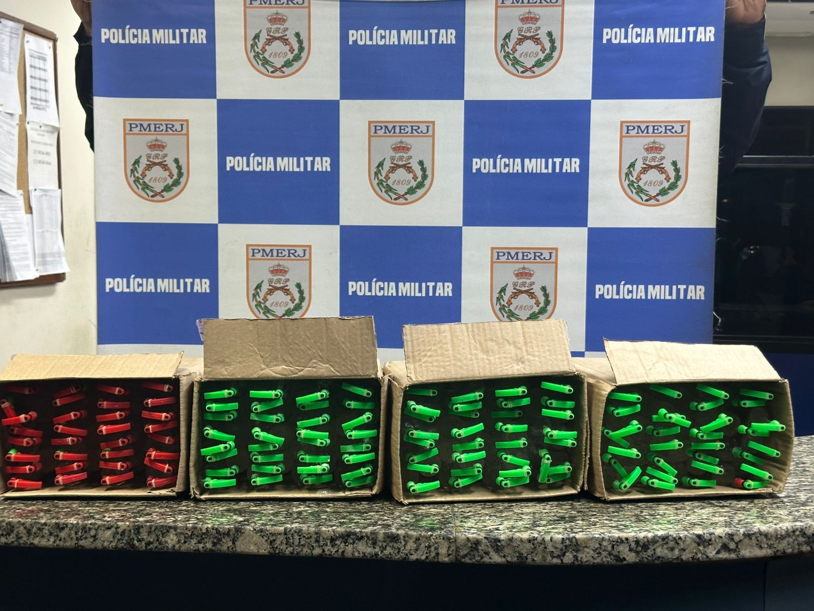 Quatro caixas contendo ao todo 127 unidades de lança-perfume foram apreendidas na noite da quinta-feira (9) em uma ação da Polícia Militar no residencial conhecido como “Predinhos”, Rua Geraldo de Paula, no Paraíso de Cima, em Barra Mansa. Quatro suspeitos fugiram. Um deles estava armado de pistola.