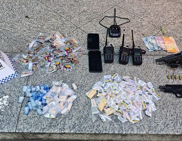 Duas ações da Polícia Militar resultaram na apreensão de dois adolescentes, ambos de 17 anos, suspeitos de envolvimento com o tráfico de drogas, na manhã desta quinta-feira, dia 30, no Condomínio Gardênia, no bairro Parque Minas Gerais, na Região das Barras. A operação teve como foco o combate ao tráfico e contou com apoio da Subseção de Aeronaves Remotamente Pilotadas (SsARP). Durante a ação, foram apreendidos entorpecentes como maconha, cocaína e haxixe, além de uma pistola Taurus PT58S calibre .380 com numeração raspada, uma réplica de arma de fogo, munições, carregador, rádios comunicadores, celulares e a quantia de R$ 59 em dinheiro.