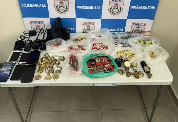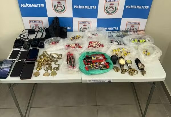 De acordo com a PM, durante a ação foram apreendidos cordões, dinheiro, drogas, quatro relógios, três rádios transmissores, seis celulares e um carregador de rádio. A quantidade de drogas apreendidas ainda não foi informada. (Foto: PM/Divulgação)