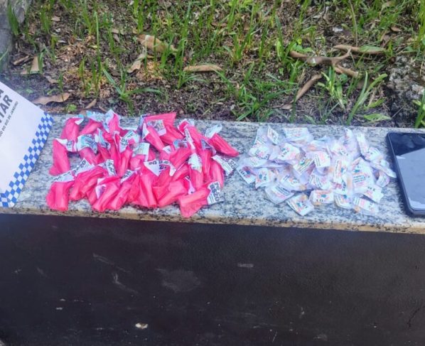 De acordo com a PM, os policiais suspeitaram de um indivíduo que carregava uma sacola plástica preta e demonstrou nervosismo ao perceber a aproximação da viatura, tentando fugir do local. O suspeito foi alcançado e detido, e durante a revista os agentes localizaram, no interior da sacola, 36 pinos contendo pó branco, 75 pedras aparentando ser crack e um aparelho celular.
