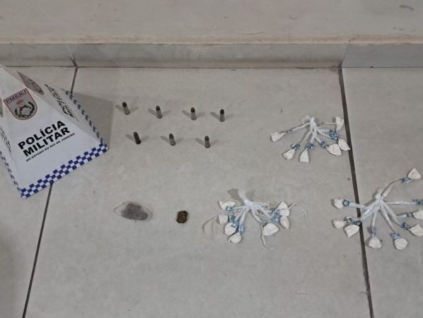 Durante buscas no imóvel, os agentes localizaram sete munições de calibre .38 escondidas em um pote plástico sobre o telhado. Em outro ponto da casa, em um buraco no muro, foram encontrados dois pedaços de maconha. Já no quintal, dentro de um pneu, os policiais encontraram 22 sacolés de cocaína armazenados em uma sacola plástica.