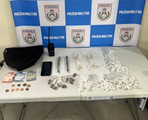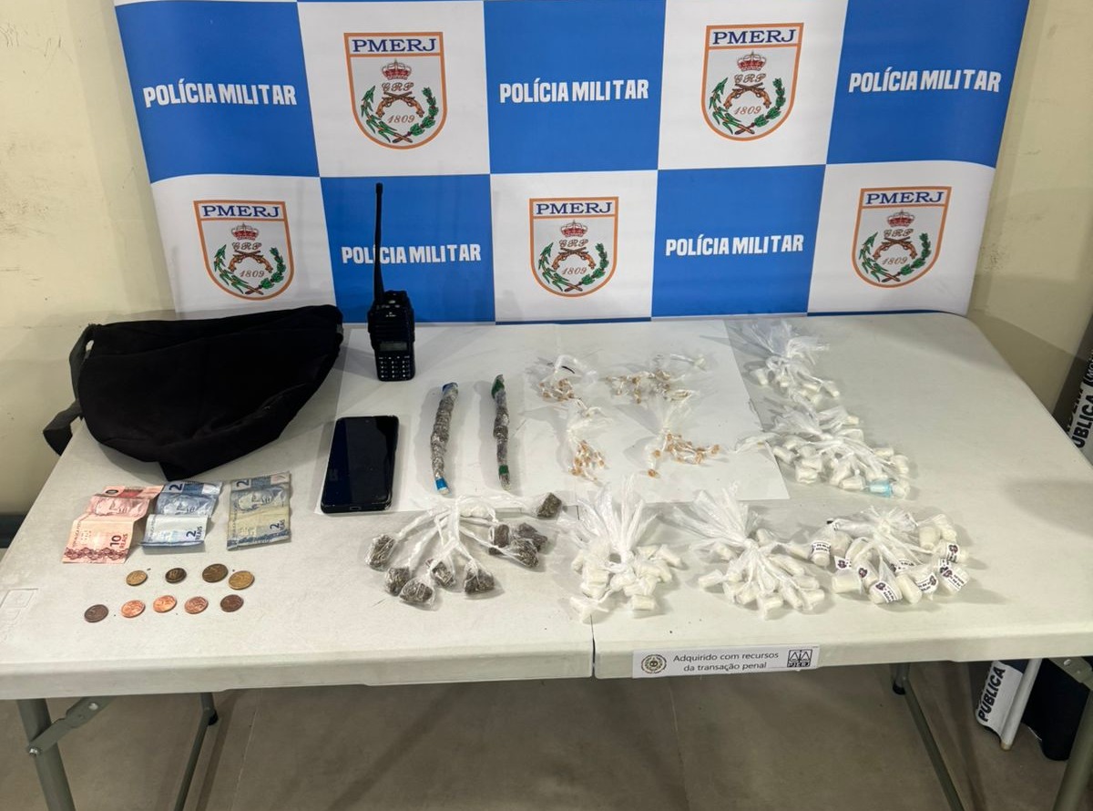De acordo com a Polícia Militar, drogas, como pinos de cocaína, trouxinhas e tiras de maconha, pedras de crack, foram apreendidas, assim como um rádio transmissor, um celular e dinheiro. Ele foi levado para a delegacia e ainda não há informações sobre como ficou a sua situação. (Foto: PM/Divulgação)