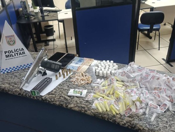 Na operação, foram apreendidos uma pistola 9mm com numeração raspada, um carregador, sete munições, 164 pinos de cocaína, 52 pedras de crack, uma porção de maconha e dois aparelhos celulares.
