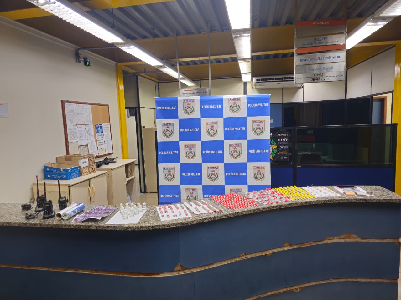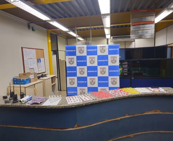 O trio estava em um dos apartamentos e com eles foram apreendidos 155 pinos de cocaína, 15 frascos de loló, 18 pedras de crack, 23 trouxinhas de maconha, três rádios comunicadores, uma balança de precisão e uma folha com etiquetas do tráfico. Na delegacia, todos foram autuados pelo crime.
